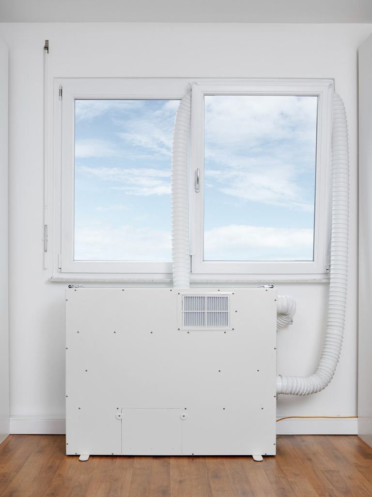 Der mobile Luftwärmetauscher wird ganz einfach vor ein gekipptes Fenster gestellt. Der Zu- und der Abluftschlauch werden seitlich durch das gekippte Fenster geführt. Vorher wird der mitgelieferte Stoffkeil mittels Klettverschluss an der Öffnung befestigt. Jetzt muss das Gerät nur noch an einer Steckdose angeschlossen und eingeschaltet werden.